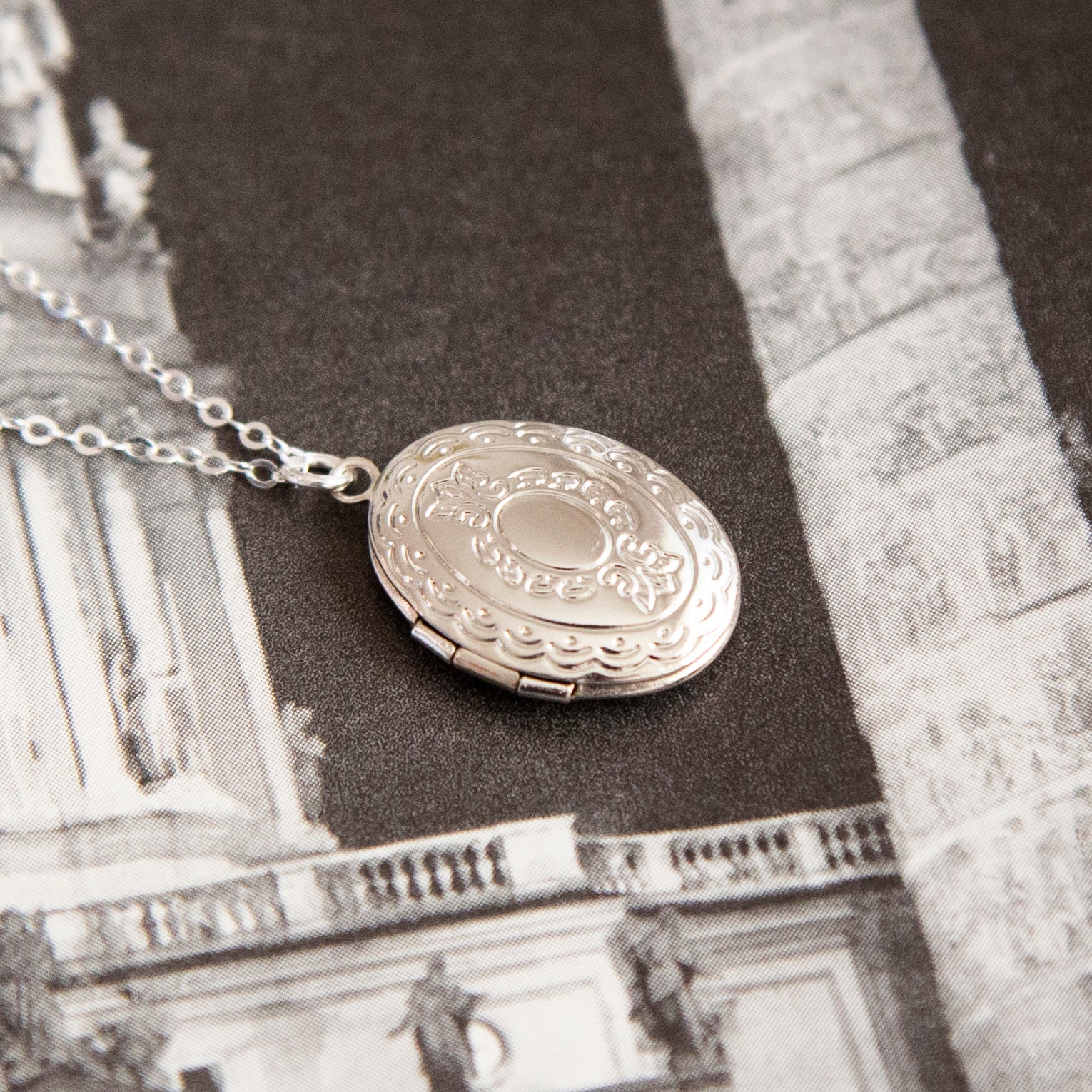 Deadstock vintage medium sized, silver-plated oval locket with elegant, classic style stamping on the front. Comes on a 16 or 18in hypoallergenic, 100% recycled sterling silver cable chain - your choice. Locket opens!